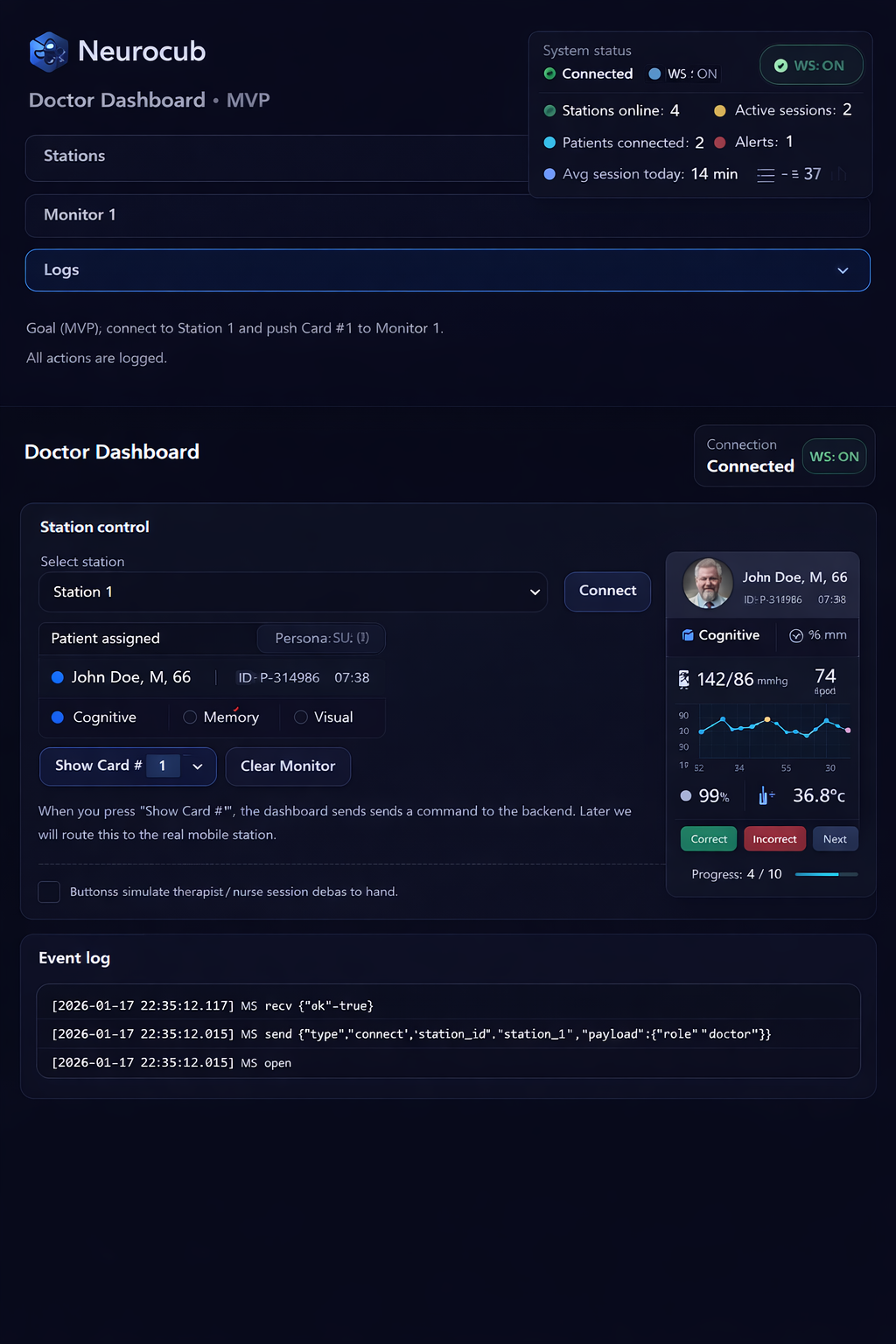 Neurocub converts daily bedside activity into a structured, trackable care workflow. Each session produces documented interaction data, session summaries, and progression context that can be reviewed across teams and shifts. Centralized dashboards allow clinics and rehabilitation centers to supervise many patients, standardize engagement formats, and build continuity between therapists, nurses, and care staff. Over time, Neurocub becomes not just a device, but an operational layer for scalable cognitive engagement programs.