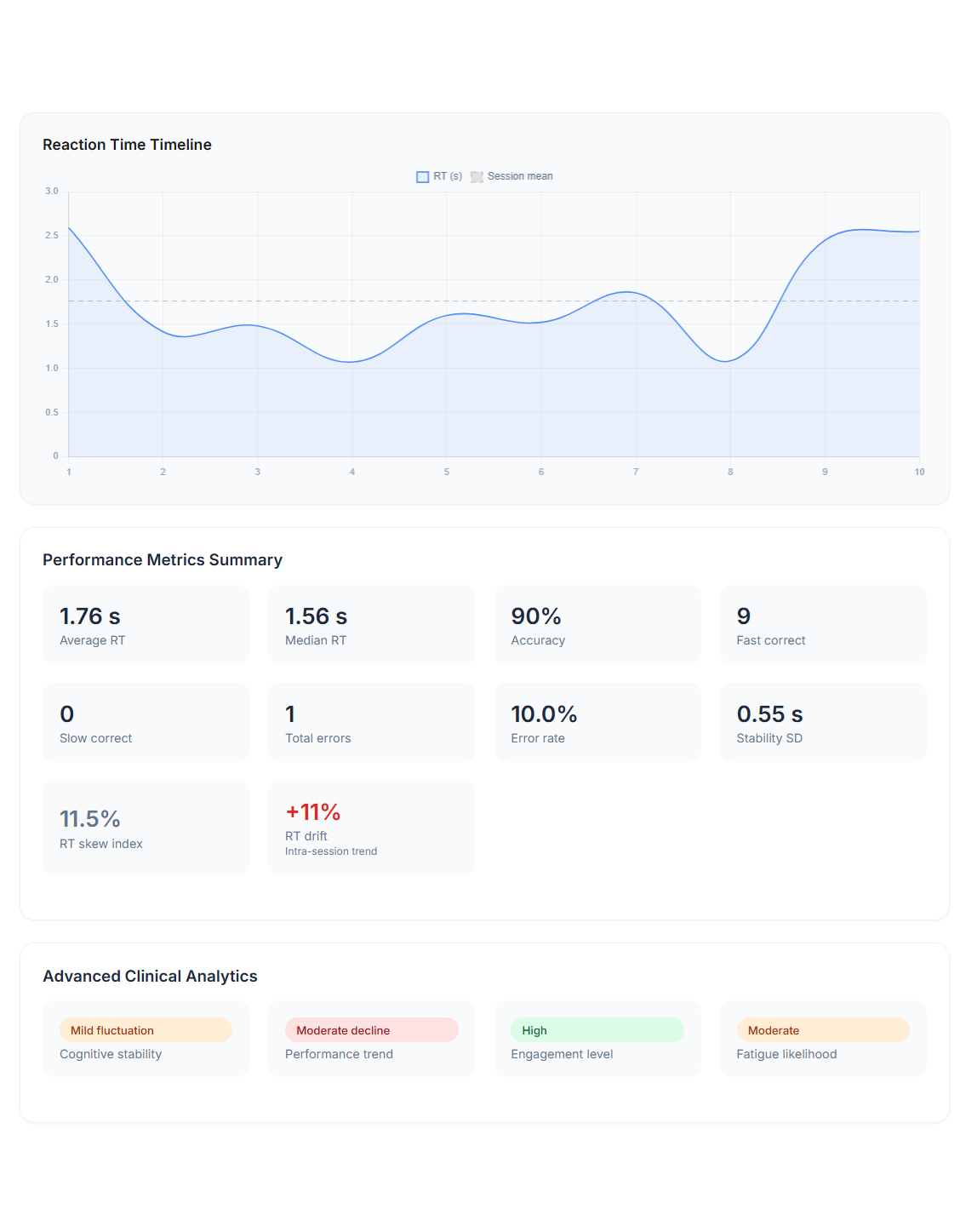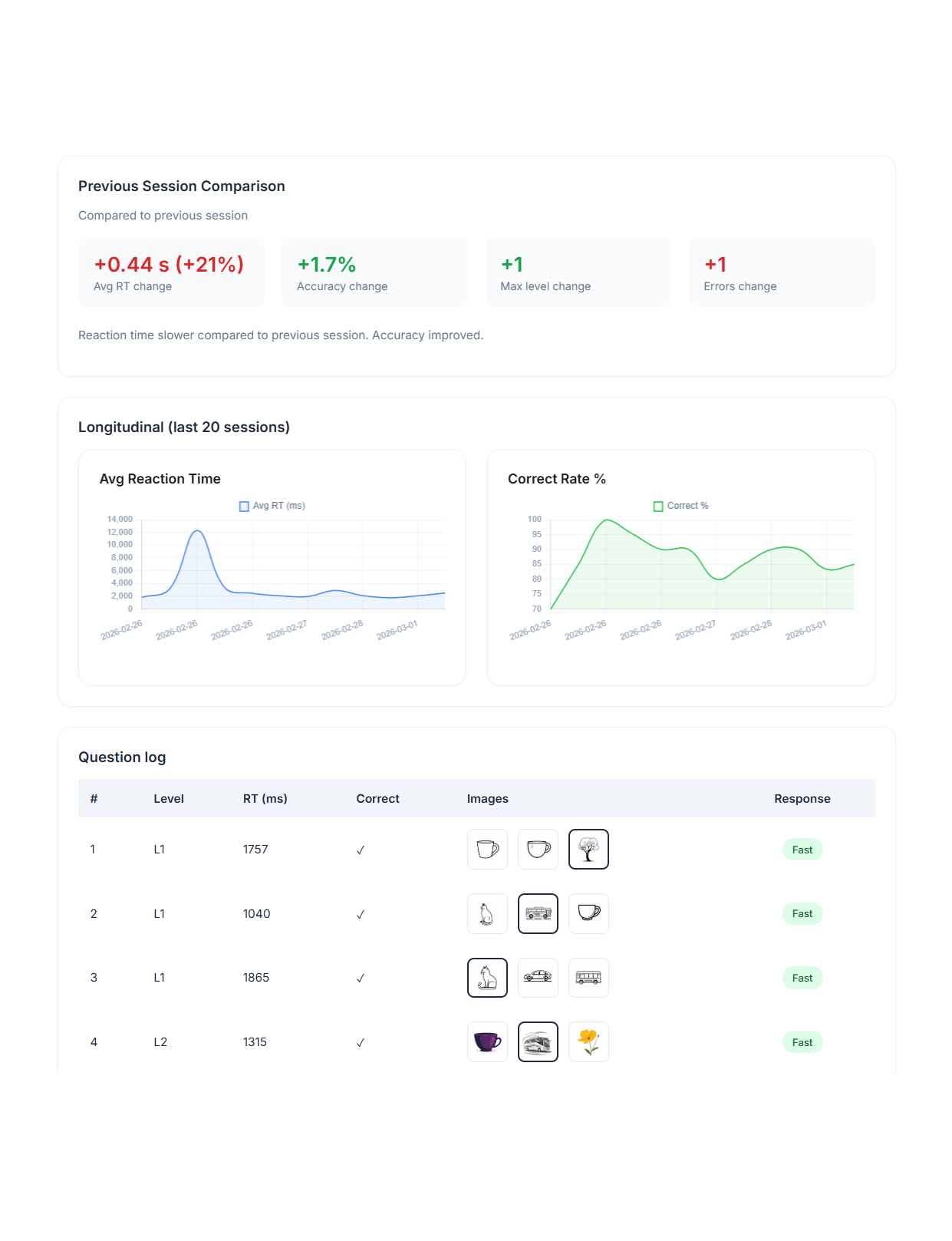 Each session generates structured, reviewable data: task type, completion, response timing, prompts used, and consistency patterns.