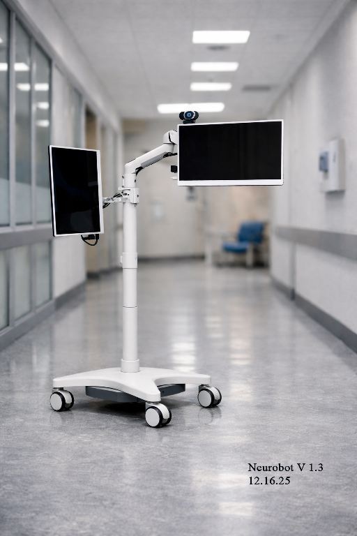 NEUROBOT integrates a dual-screen therapeutic interface within a clinically optimized hardware architecture. The station supports supervised cognitive therapy, real-time monitoring, and structured rehabilitation workflows without compromising safety or regulatory considerations. Designed for continuous clinical use, it combines electrical reliability, mechanical stability, hygienic compatibility, and advanced therapeutic functionality in a single mobile platform suitable for modern hospital infrastructure.