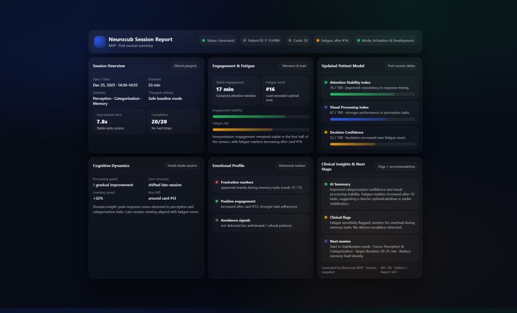 The analytical core of Neurocub. Here, the system processes patient reactions: timing, accuracy, hesitation, repetition patterns, engagement drops, recovery signals, and response stability. Every interaction becomes a neurological data point.