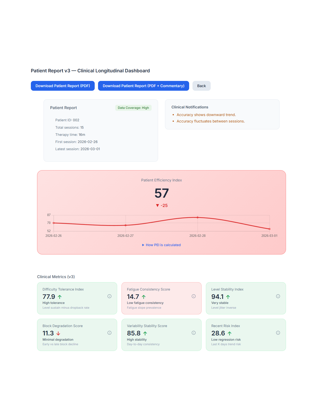 • Clinical performance metrics — attention, reaction, recognition, memory, task stability, and engagement dynamics